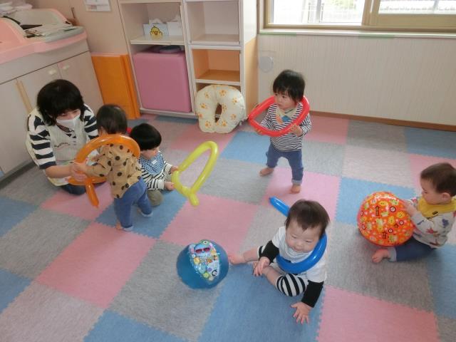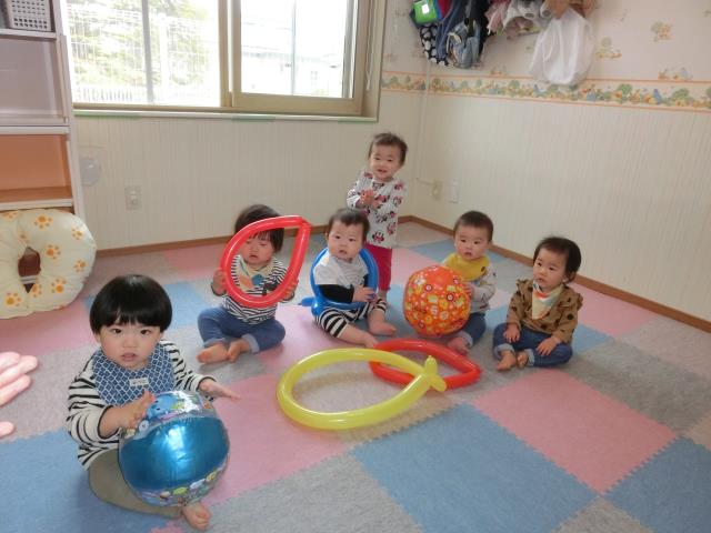 風船に興味津々の様子で、感触を楽しんでいましたよ。