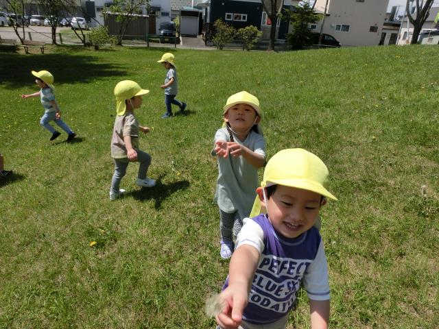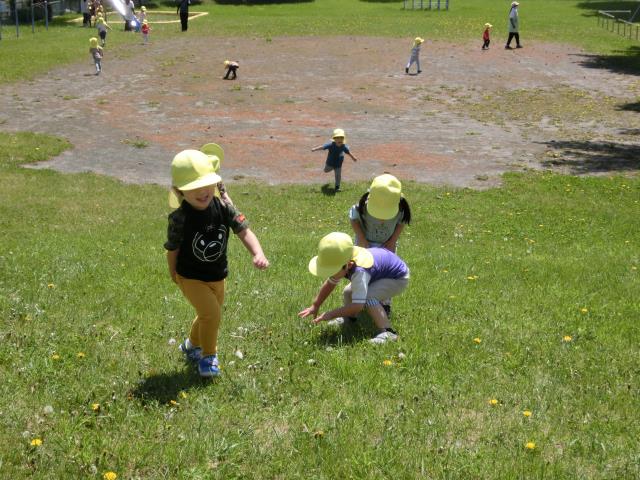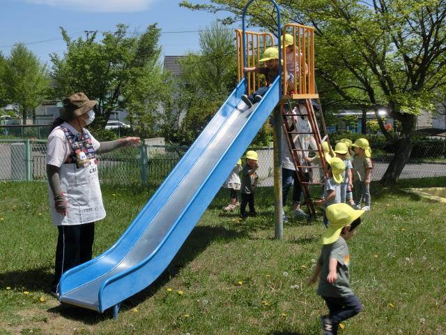 先生と追いかけっこをしたり、たんぽぽの腕時計をつけてもらったり、すべり台を滑ったり。