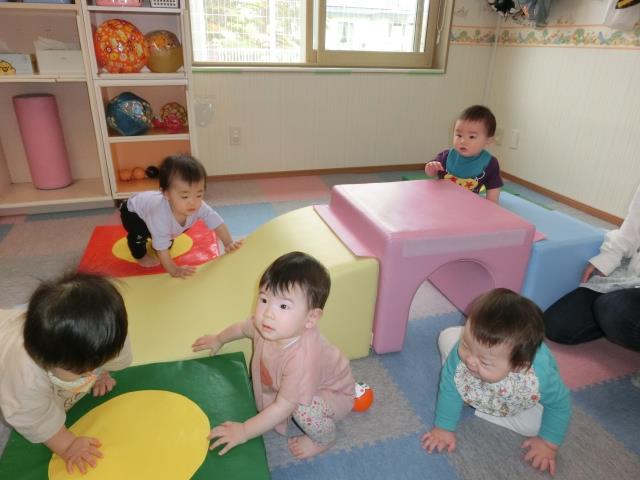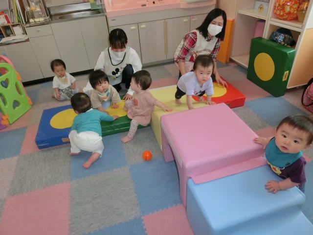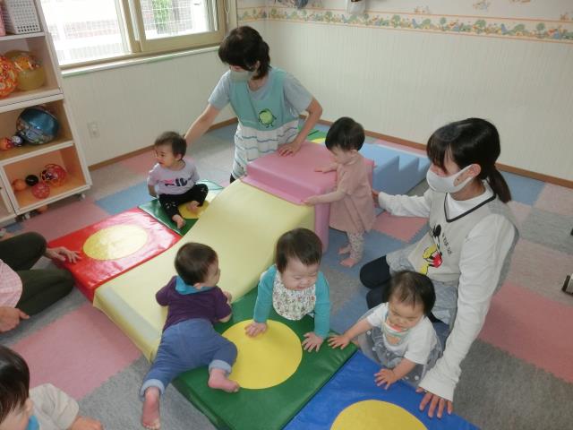 今日のひよこぐみは、JPクッションやすべり台でたくさん体を動かして遊びましたよ。