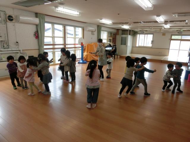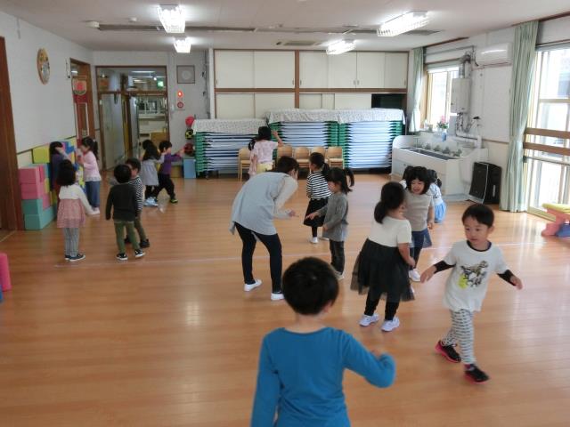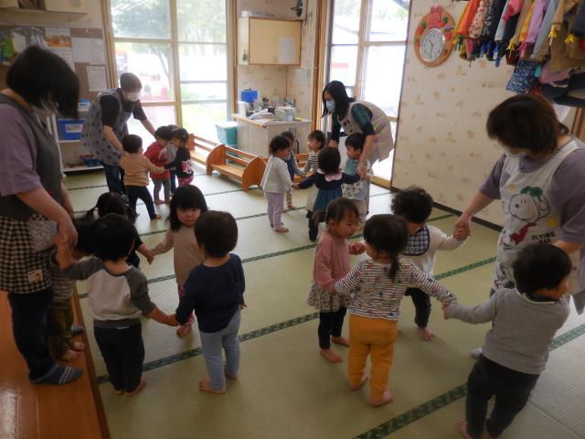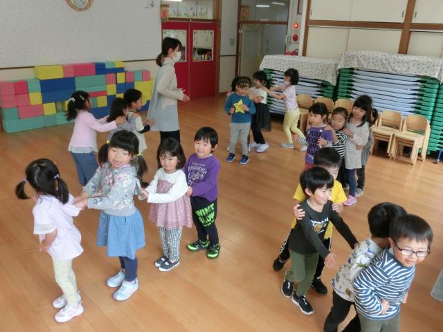 お友だちや先生と手をつないで、歌に合わせて跳んだり回ったりして、楽しく遊んでいます。