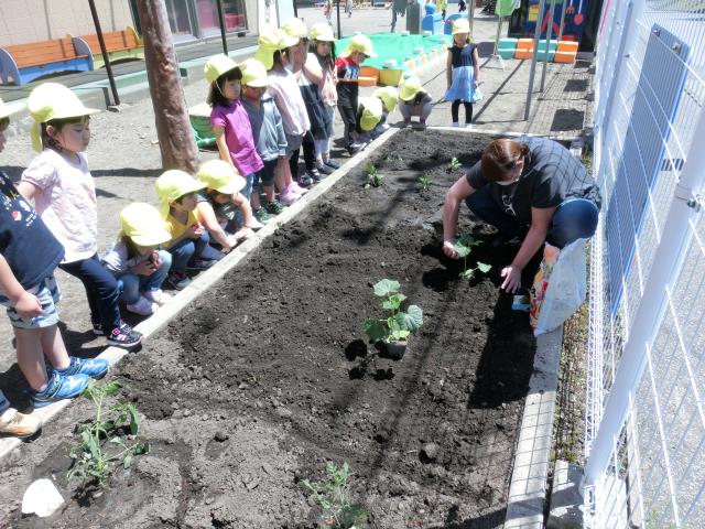 お誕生会後には、畑に「ピーマン・なすび・きゅうり・人参」を植えています。