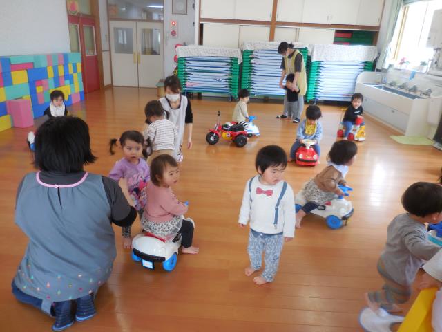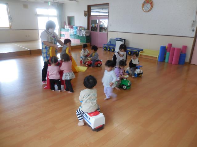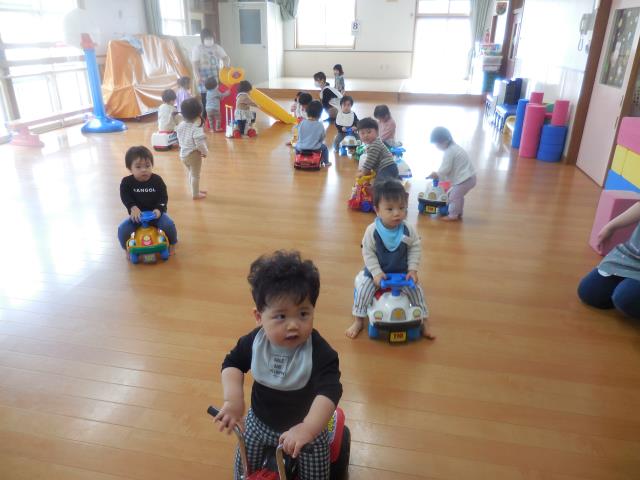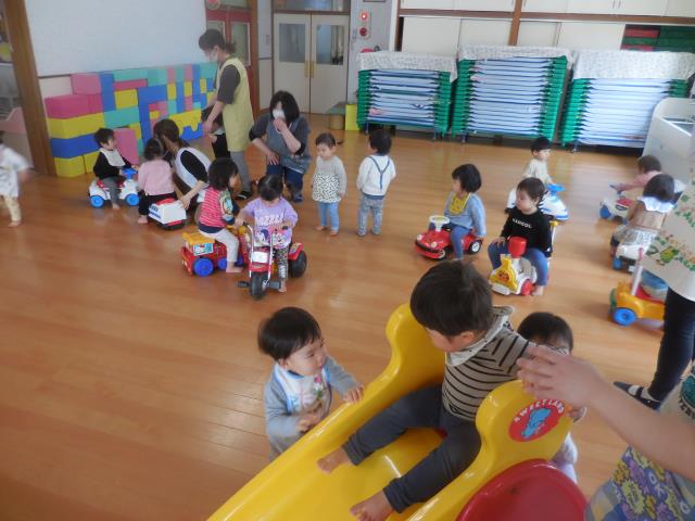 今日のつくしぐみは、ホールで滑り台すべりや車に乗って遊んでいます。
