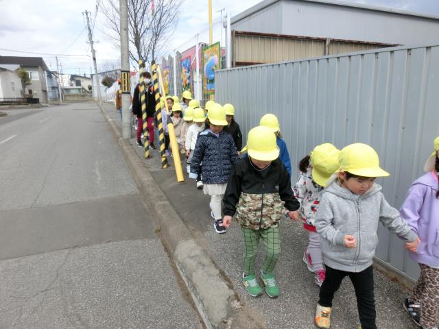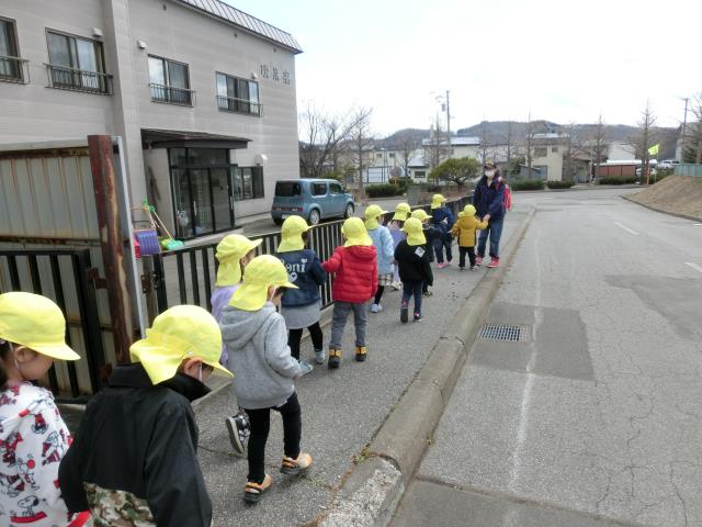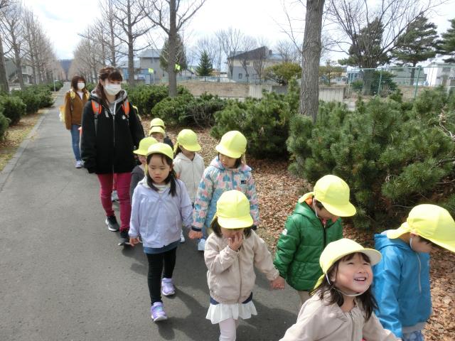 お友だちと仲良く手をつなぎ、「ふきのとう」や「福寿草」「チューリップの葉っぱ」を発見しながら歩いています。
