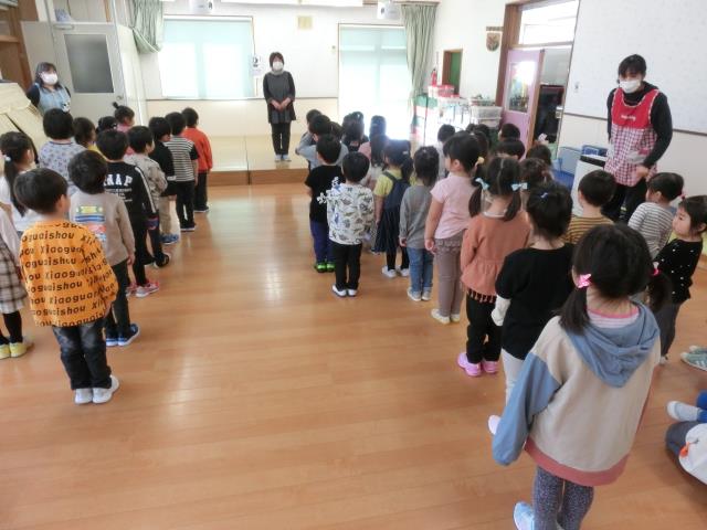 大きいお友だちは、1つ大きくなった事で整列する場所がかわり、嬉しそうにしていた子ども達です。