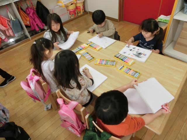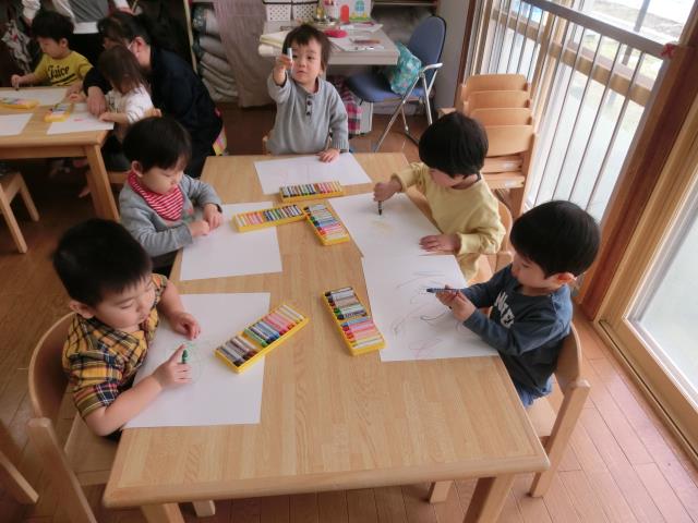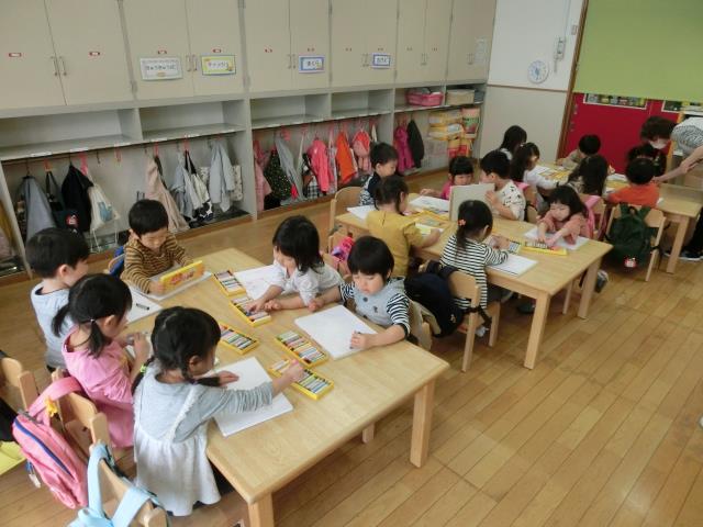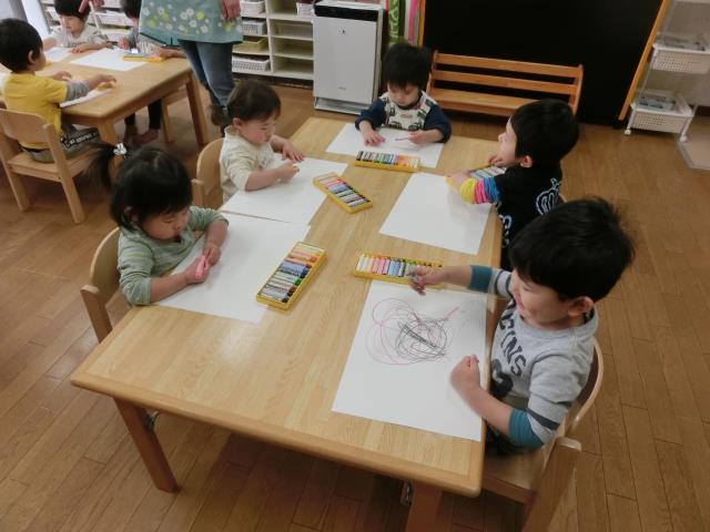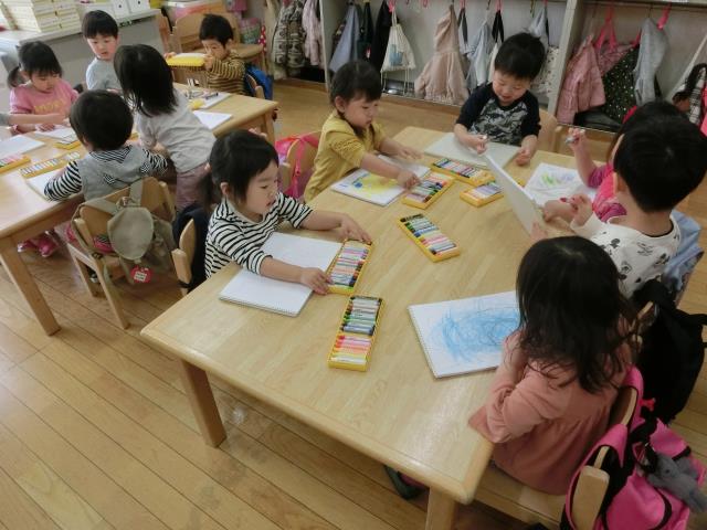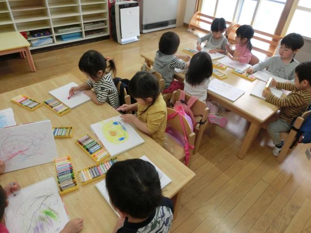 クレヨンの使い方を確認し、アンパンマンや虫、虹などのびのびと描いていた子ども達です。