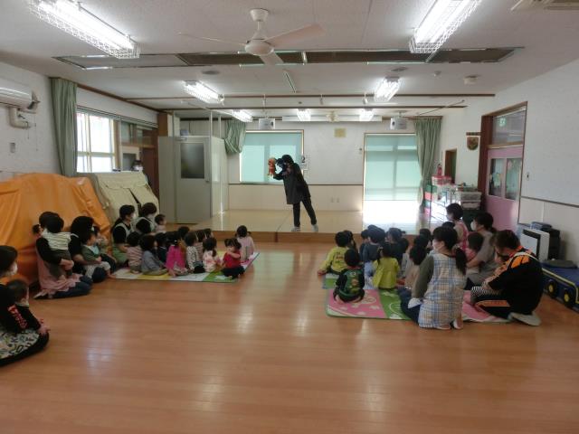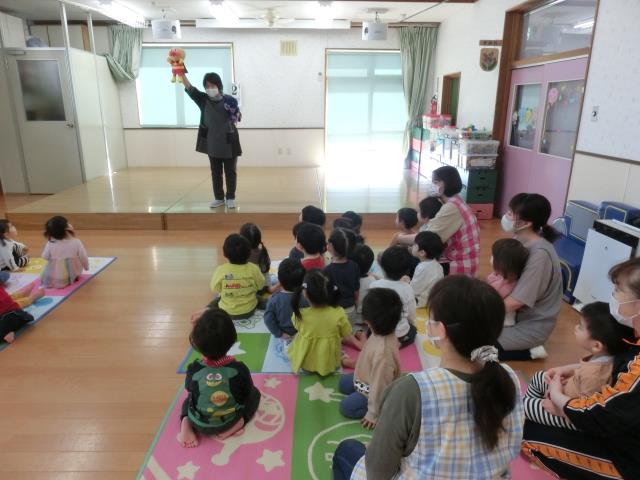 小さいお友だちは、アンパンマンとバイキンマンの人形を持った園長先生のお話を、ニコニコしながら聞いていましたよ。
