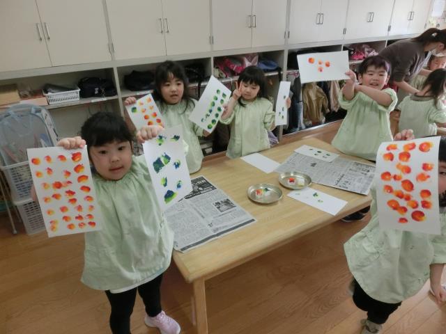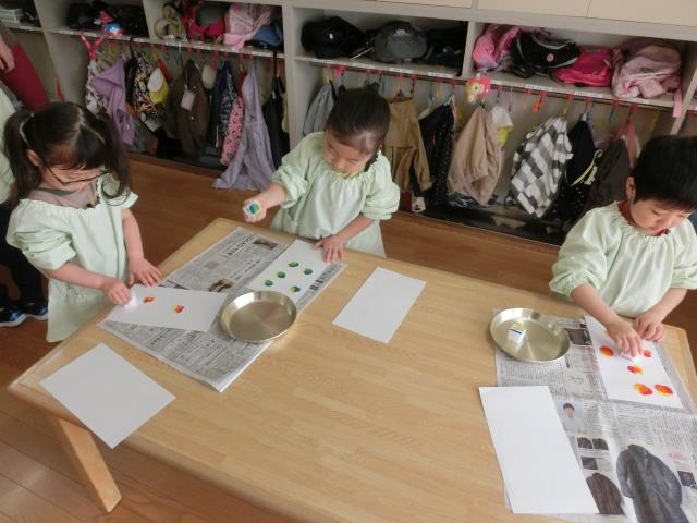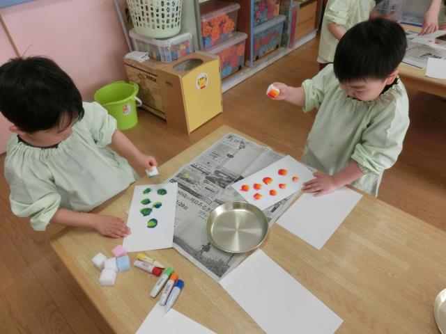 スポンジに三色の絵の具をのせ、クルッと回転させて出来る色のグラデーションが楽しめるスタンプをしています。