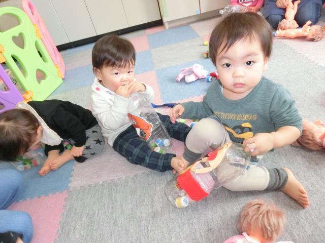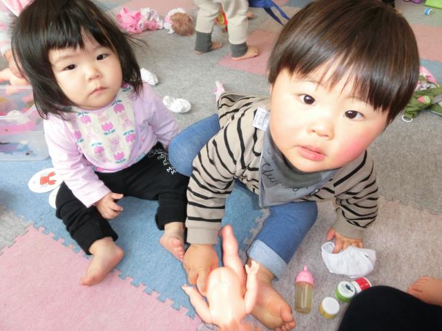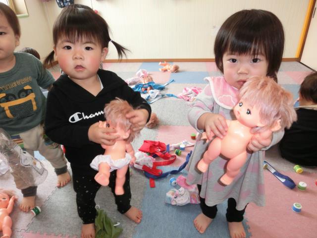お母さんの真似っこをしてミルクをあげたり、抱っこをしたり、おんぶ紐で背中に背負いニコニコのお友だちもいました。