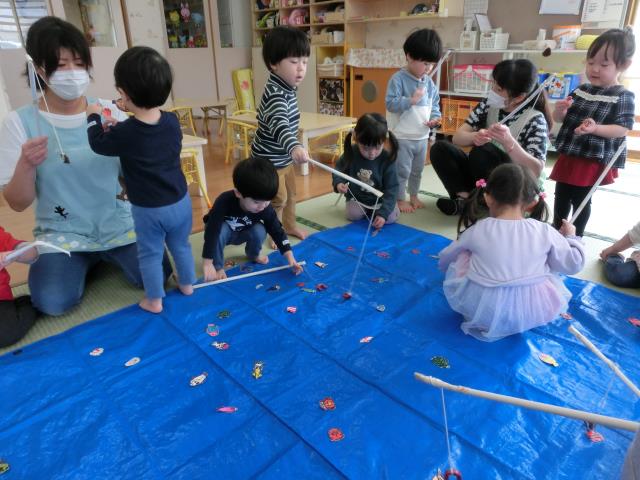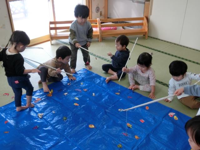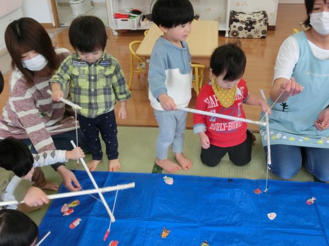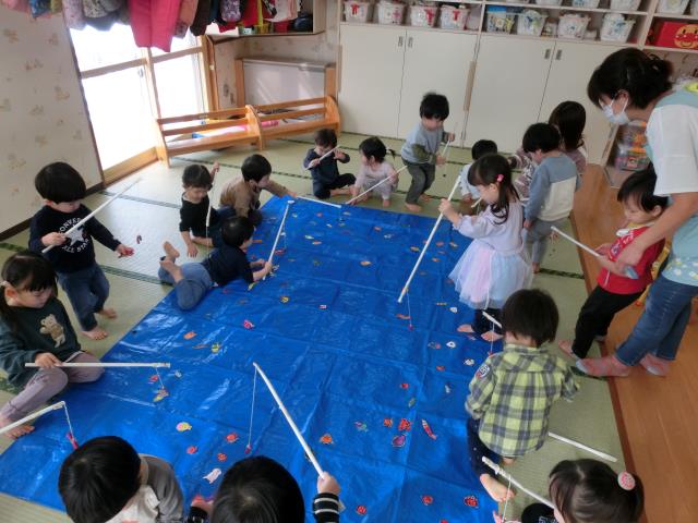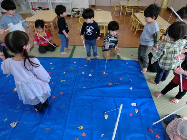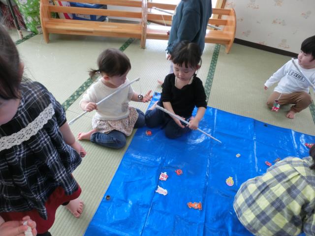 今日のつくしぐみは、お部屋で「つくし組釣り堀」を開店させ、みんなで魚釣りをして楽しんでいます。