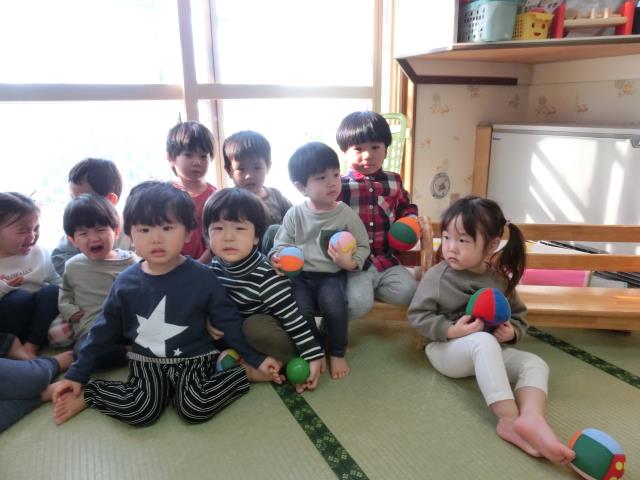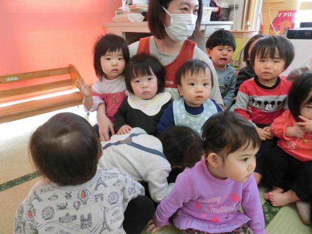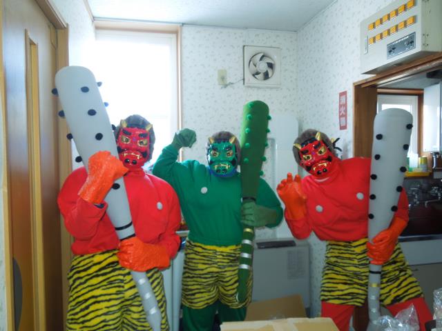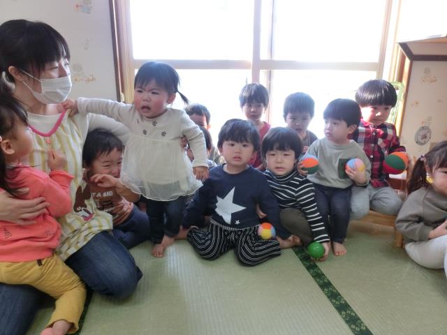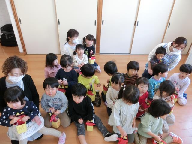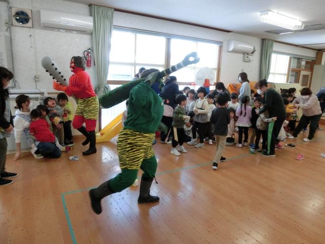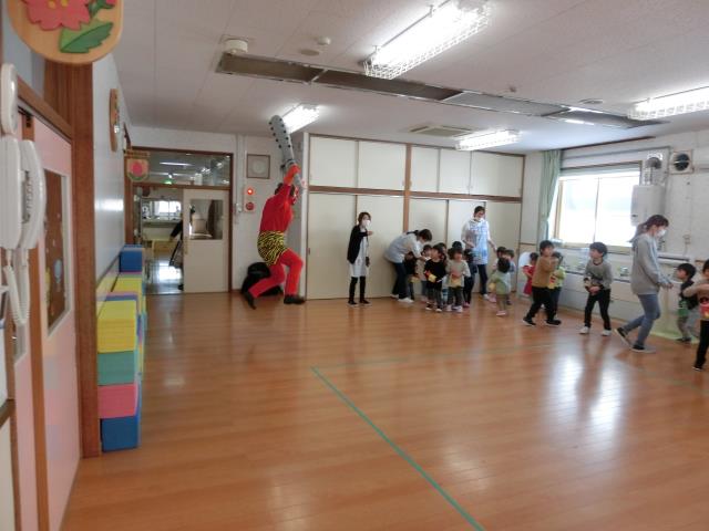 つくしぐみのお部屋で一緒に「まめまき」の歌をうたい、気合を入れて準備をしていましたが・・・鬼の登場と共に泣き声の大合唱。