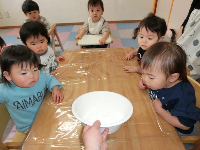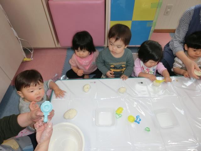 今日のひよこぐみは、初めての小麦粉粘土をして遊んでいます。
