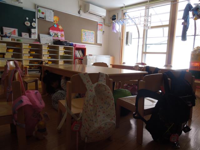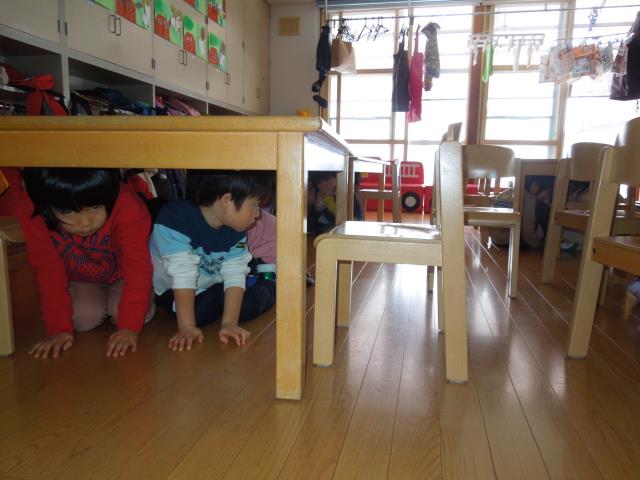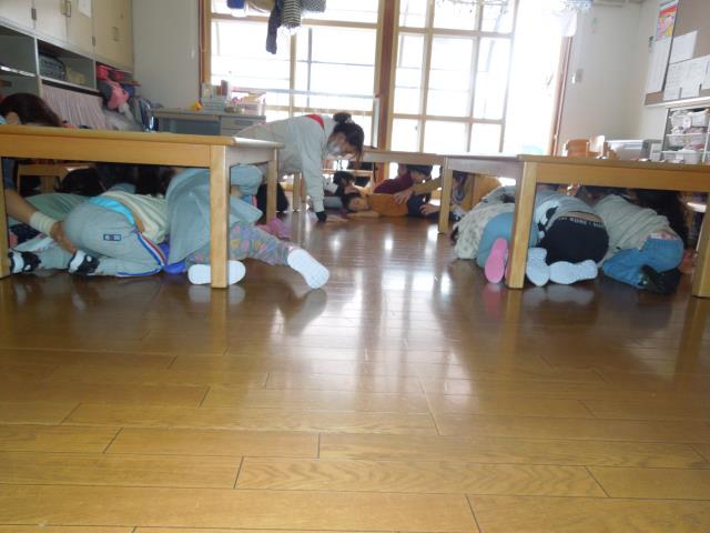 予告なしだったため、ビックリしたお友だちもいましたが、ほとんどのお友だちが放送や先生の話を聞いて、上手に行動することができていましたよ。
