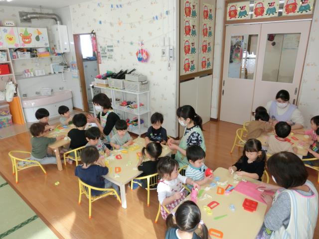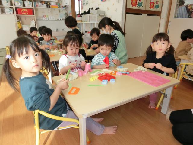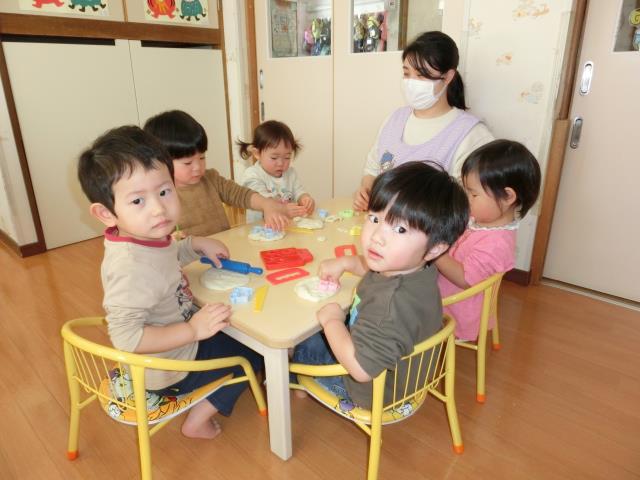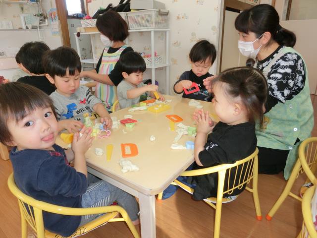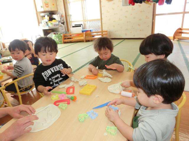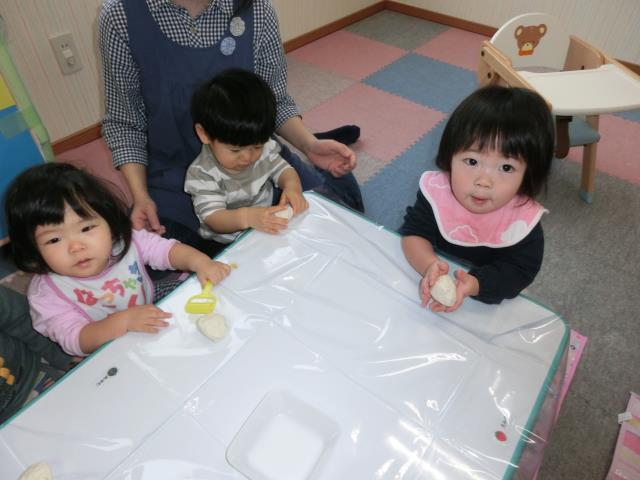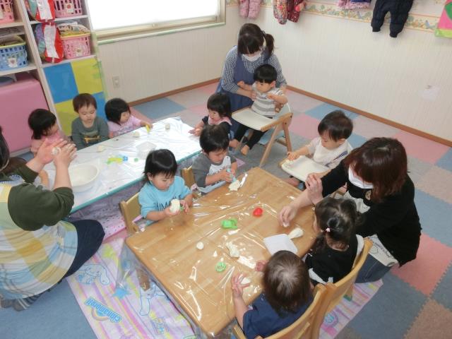 保育教諭と一緒にコネコネしたり、形を作ったり、感触を楽しみましたよ。