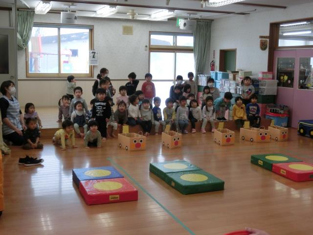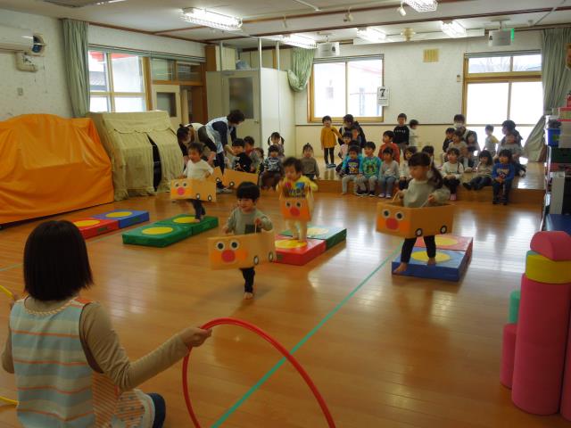 つくしぐみは、アンパンマン号に乗り込み、自分の足でJPクッションやフラフープくぐりをしています。