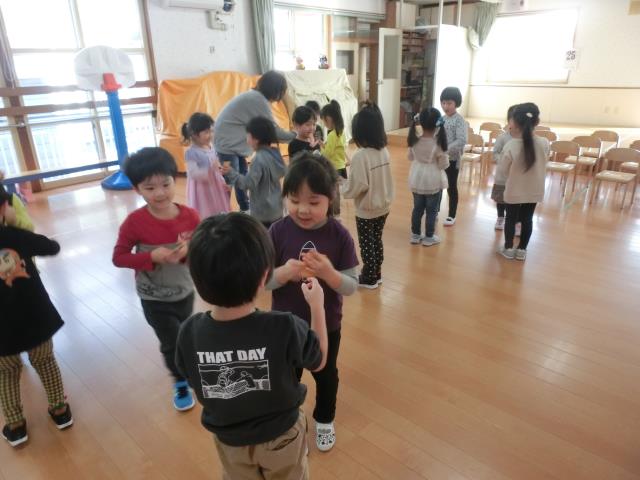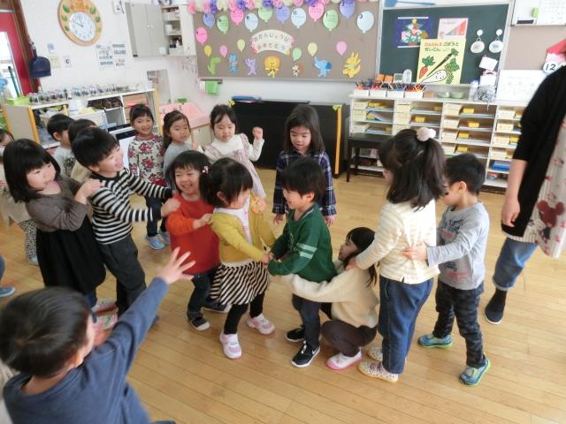 誕生児さんのリクエストにより、大型絵本「にんじんとごぼうとだいこん」を見た後、「ロンドン橋」という集団遊びを取り組みました。