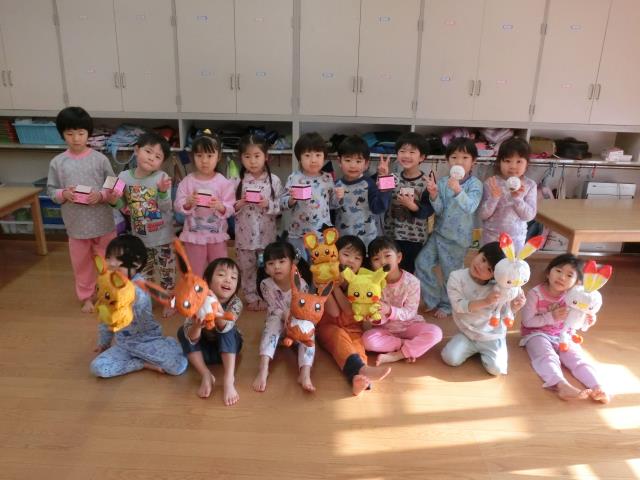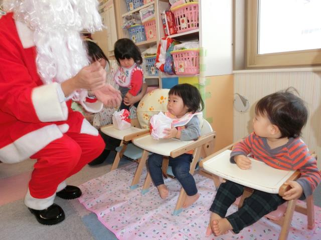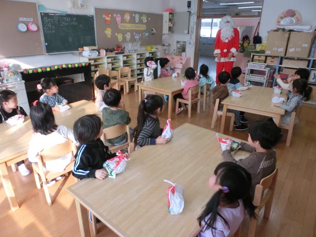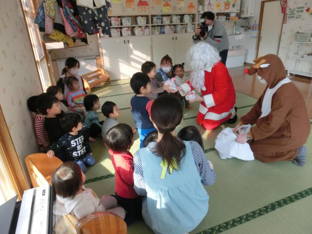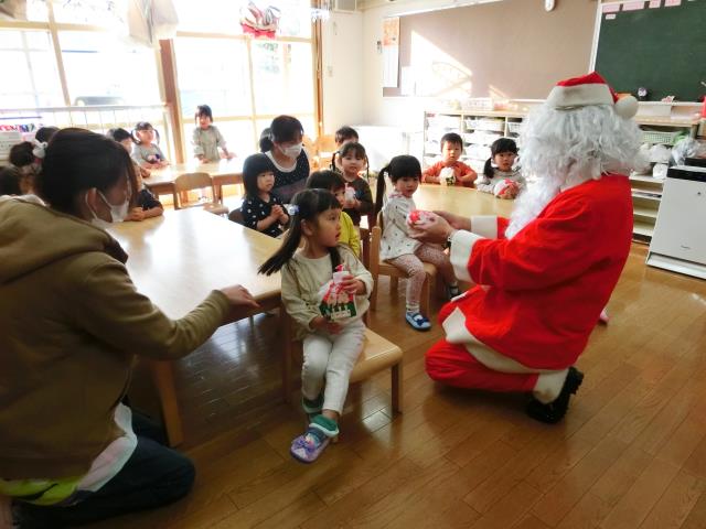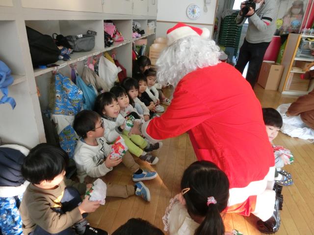 小さいお友だちはビックリして泣いてしまった子もいましたが、大きいクラスのお友だちはとっても嬉しそうにプレゼントを受け取っていましたよ!