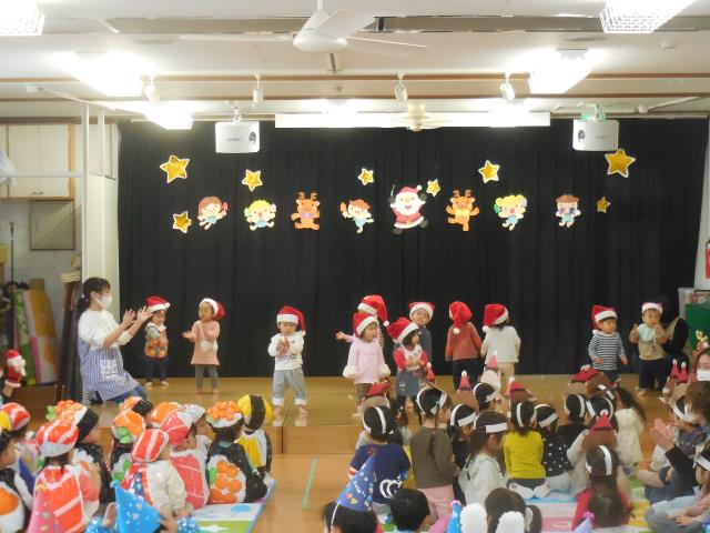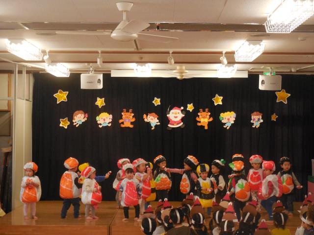 園長先生からクリスマスについてのお話を聞いた後、各クラスお遊戯の発表をしています。