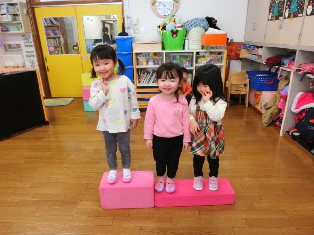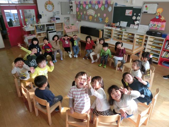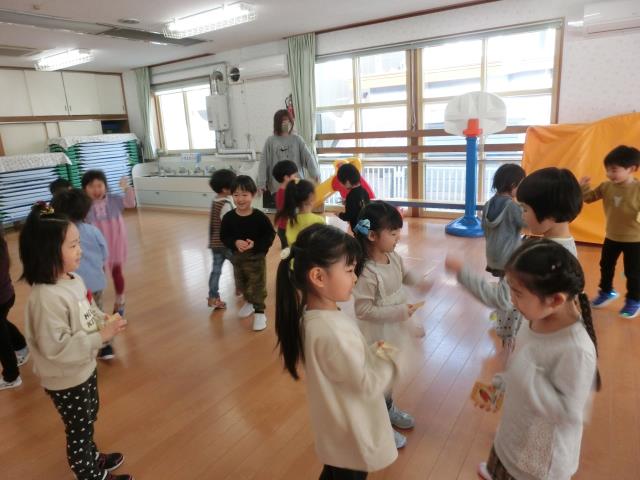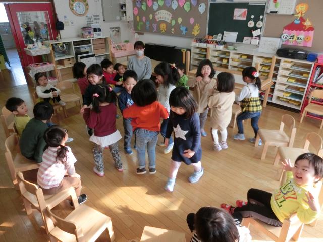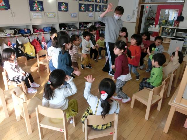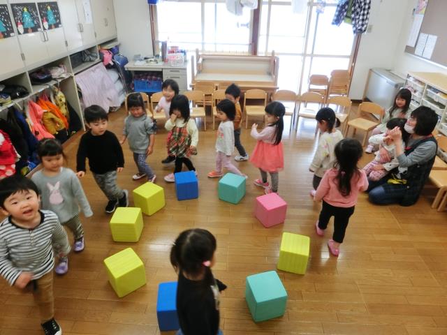 すみれぐみは、ジャンボカルタ大会とイス取りゲームを行っています。
