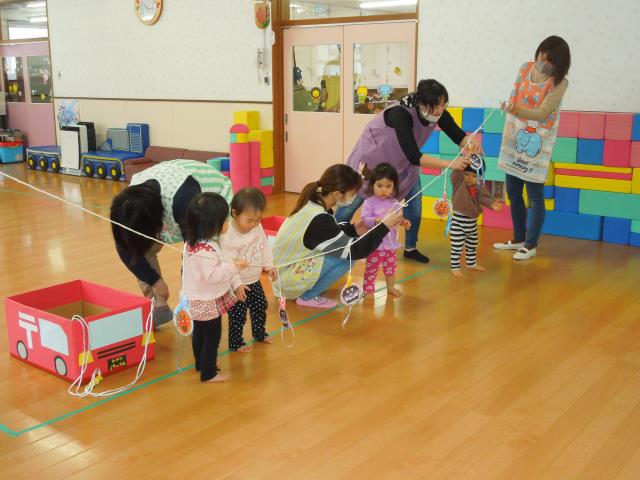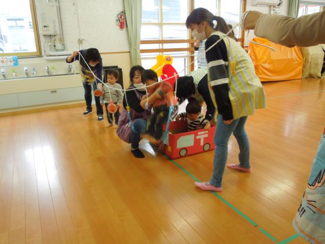 ひよこぐみは、ダンボール製の車に乗り、先生達に引いてもらいました。