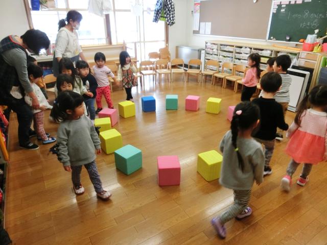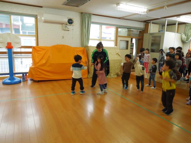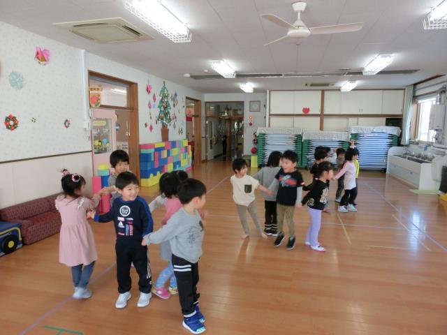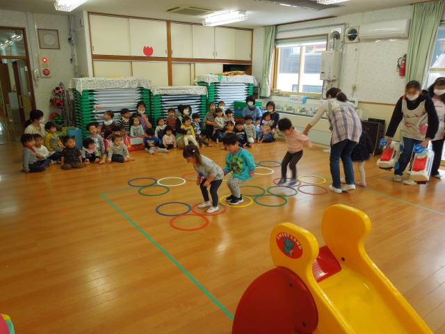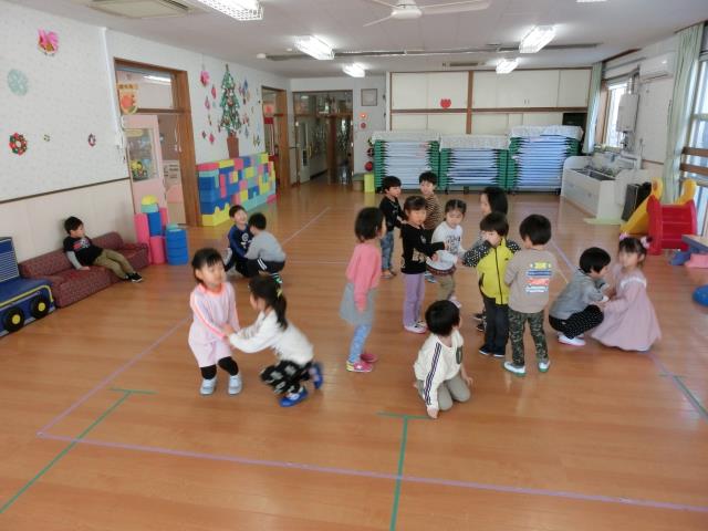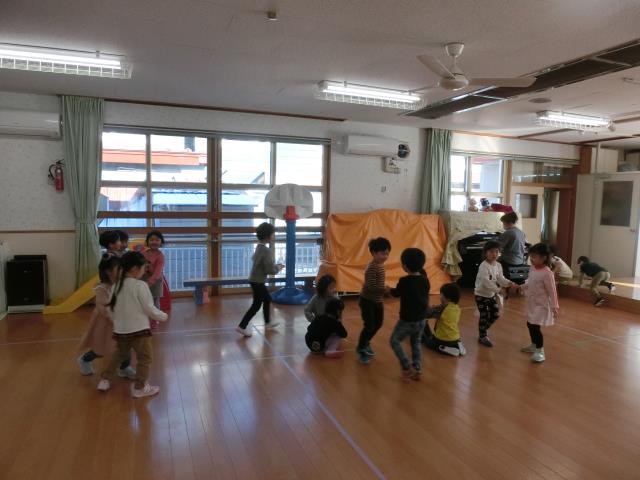 集団遊びは、ピアノの曲に合わせて元気よく歌ったり、グループを作って潜り抜けたりと元気よく遊びましたよ。