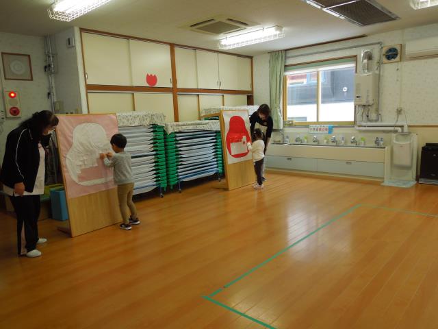 ちゅうりっぷ・さくら・すみれぐみは、合同で絵合わせゲームをしています。
