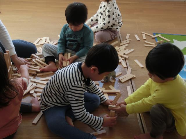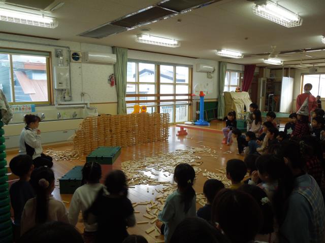 カプラは、皆で協力し大きな作品「ナイアガラ」を完成させました。最後は、全員が見守る中ナイアガラを滝のように崩し、順番に崩れていく様子や音をたのしみました。