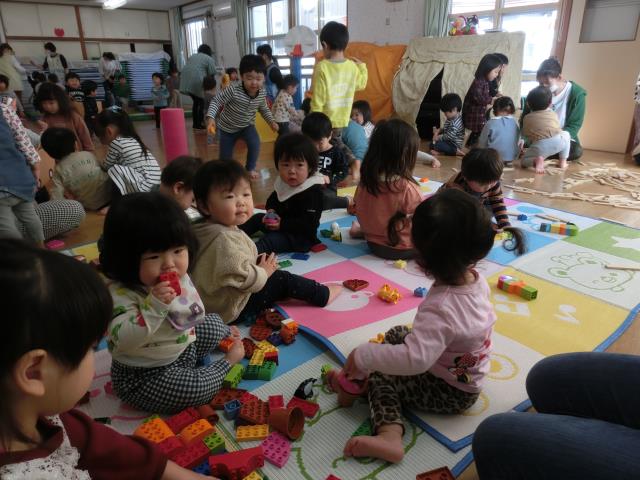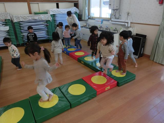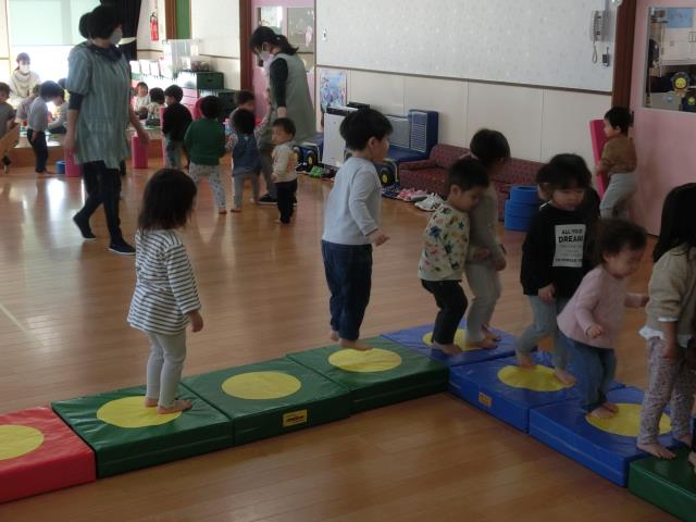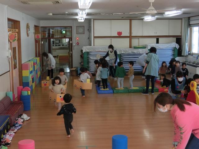 ホールでJPクッション・すべり台・カプラ・アイスブロック・アンパンマン号の各コーナーに分かれ、自分の好きな遊びに取り組んでいます。