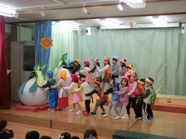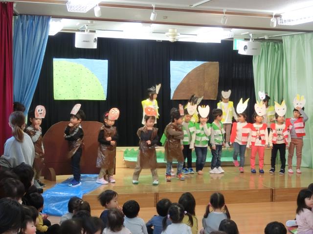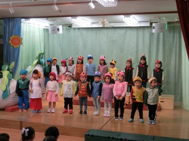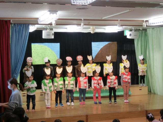 今日の演目は、たんぽぽぐみ「はじめの言葉・劇」ちゅうりっぷぐみ「はじめの言葉・劇」さくらぐみ「劇」すみれぐみ「劇・楽器演奏・歌・おわりの言葉」です。
