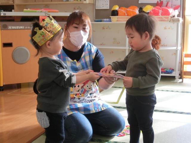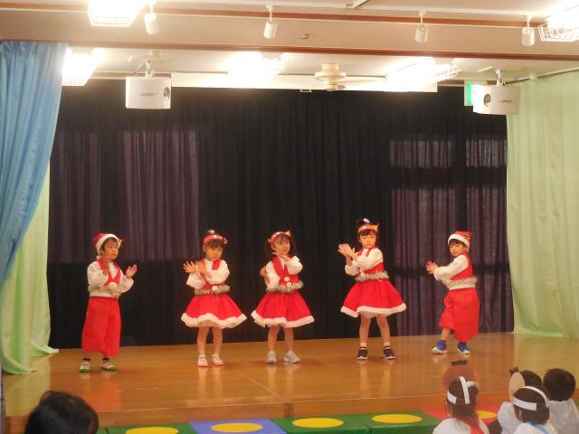 お誕生児さんへのインタビューやカードのプレゼントの後、皆で「おすしのピクニック」と「あわてんぼうのサンタクロース」を鈴を鳴らしながら踊って楽しみました。