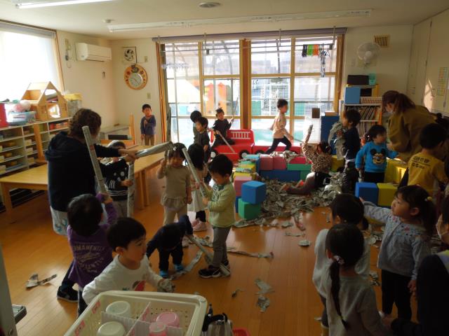 新聞紙遊びは、ダイナミックに遊んでいます。新聞紙プールで遊んだり、バイキンマンの的に剣やボールを当てて楽しみました。他にも帽子や服を作って遊んでいるお友達もいましたよ。