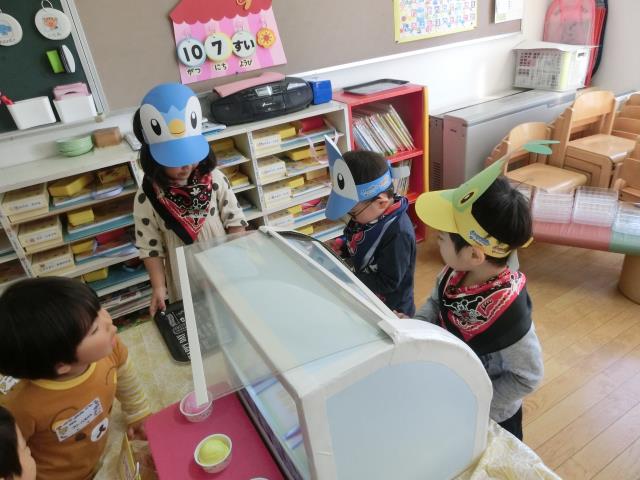たんぽぽぐみは「ケーキ屋さん」、ちゅうりっぷぐみは「コッペパン・アイスクリーム屋さん」、さくらぐみは「おばけ屋敷」、すみれぐみは「お祭り」に取り組んでいます。