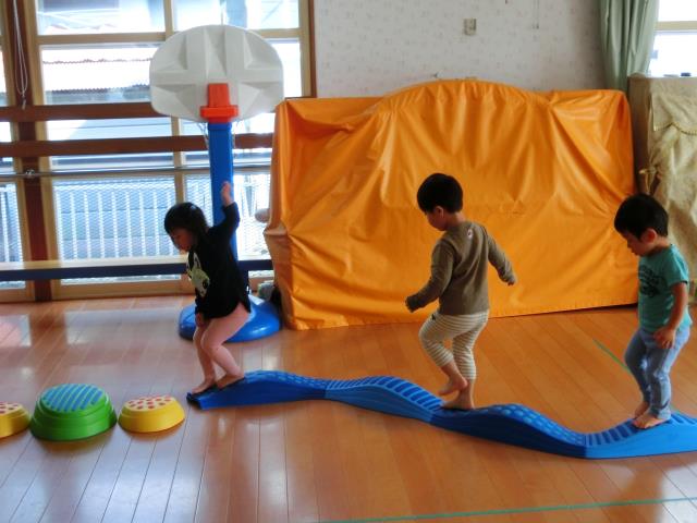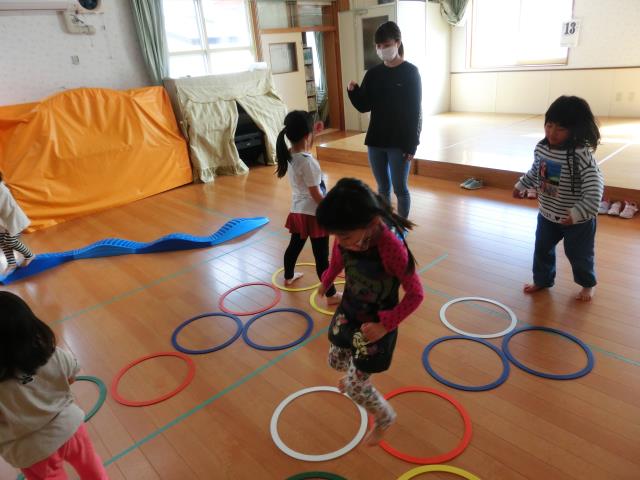 ホールではJPクッションやケンケンパ、ストーンブロックで体を動かして楽しみました。