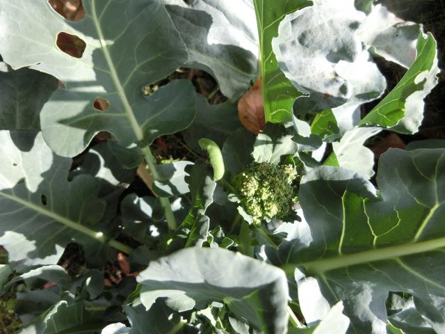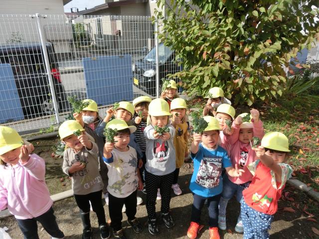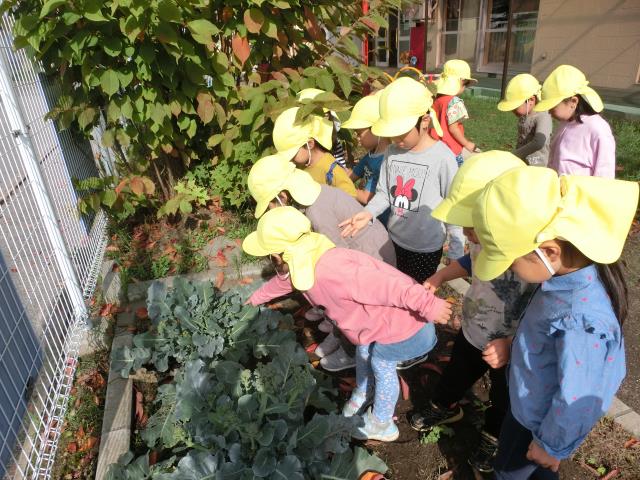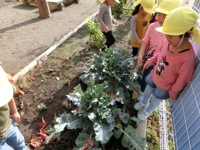さくら組さんはりんご狩りへ行く前に、ブロッコリ-の最後の収穫をしています。