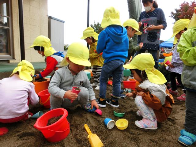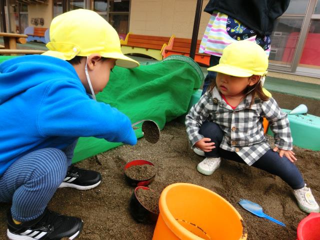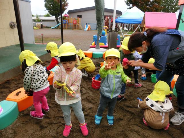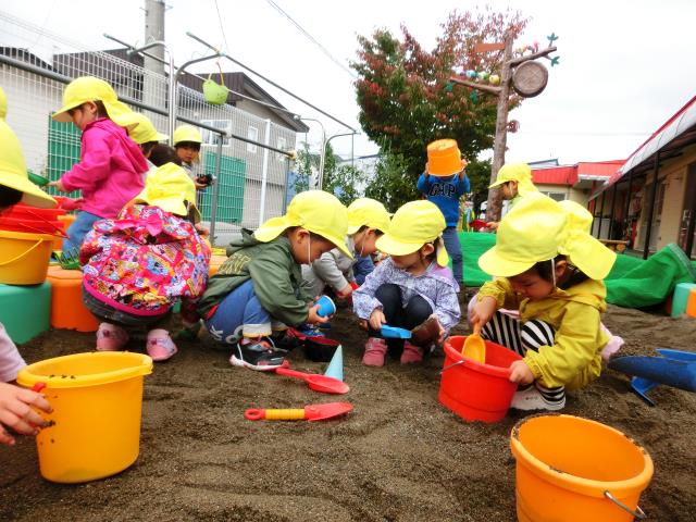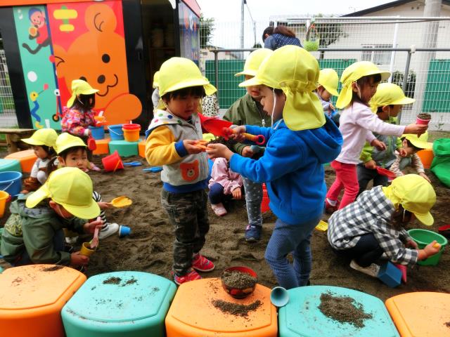 今日のたんぽぽ組は、初めて園庭のお砂場で遊びました。