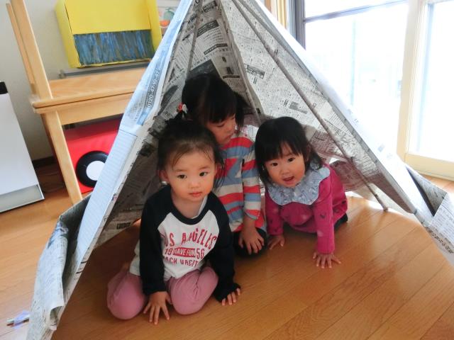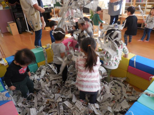 すみれ組では新聞紙遊びをしています。