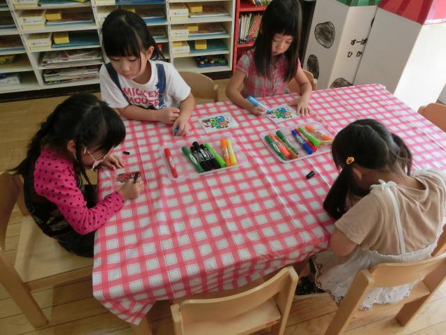 下絵を描いた物に色を塗ったり、自分で下絵から描く子もいて、皆真剣でしたよ。