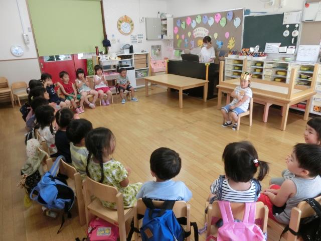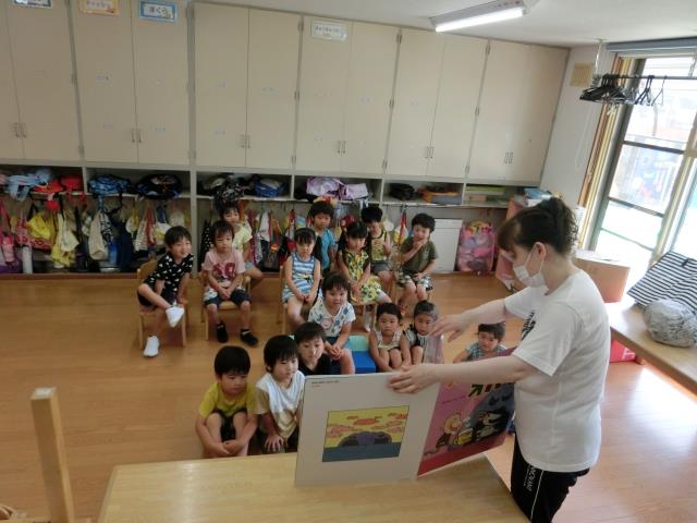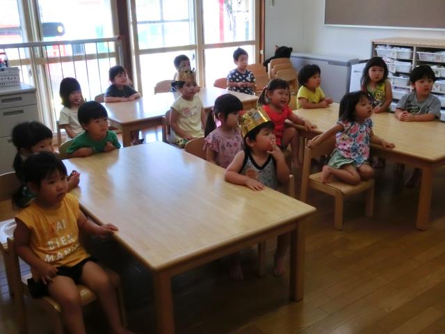 さくらぐみは、みんなでお祝いした後、お誕生のお友だちのリクエストで大型絵本「へんしんオバケ」を見ました。