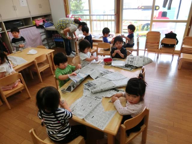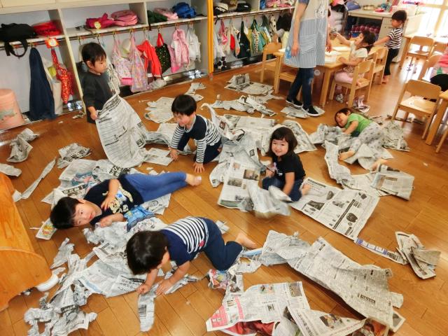 今日のたんぽぽぐみは、お外が雨だったのでお部屋で新聞紙あそびをしました。