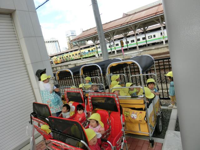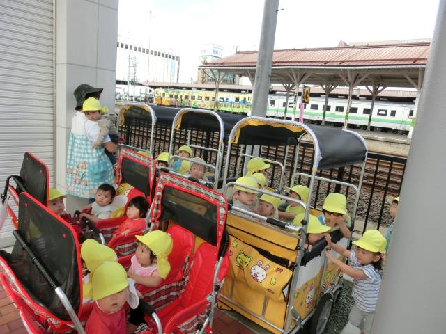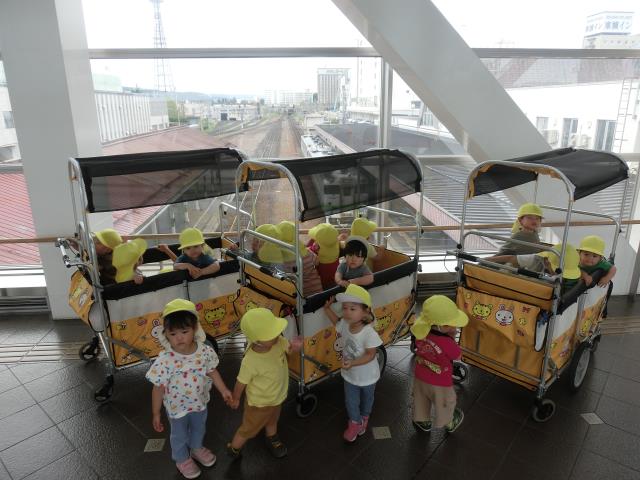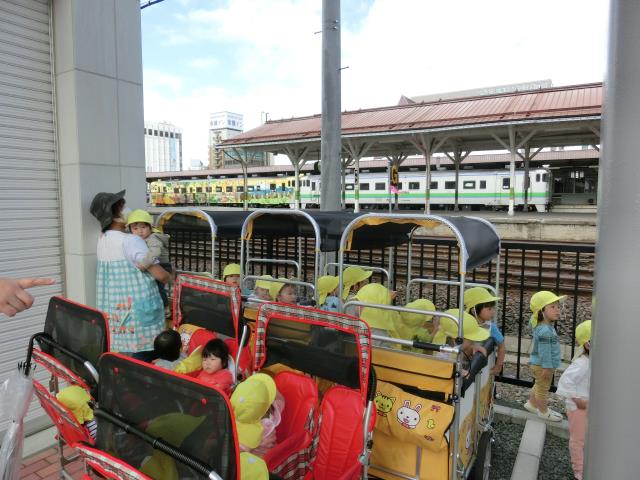 芸文前広場で汽車を、バスターミナルでバスを見て、色々な車に目を丸くしていた子ども達。