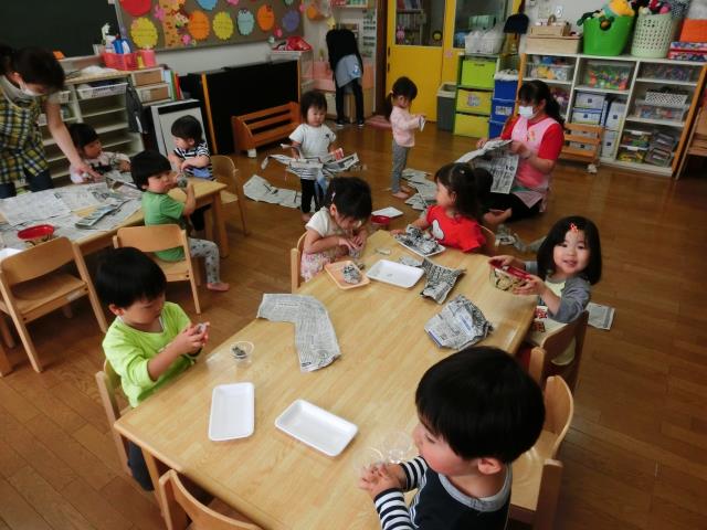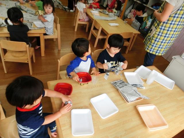 新聞紙をビリビリと破いてその中を泳いでみたり、にぎにぎと握った新聞紙をカップやトレイに入れて「アイスクリーム」や「プリン」に見立てて、おままごとをしたりしました。