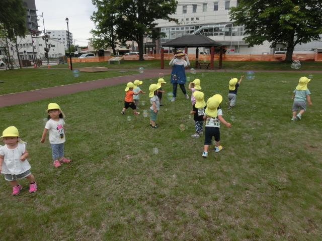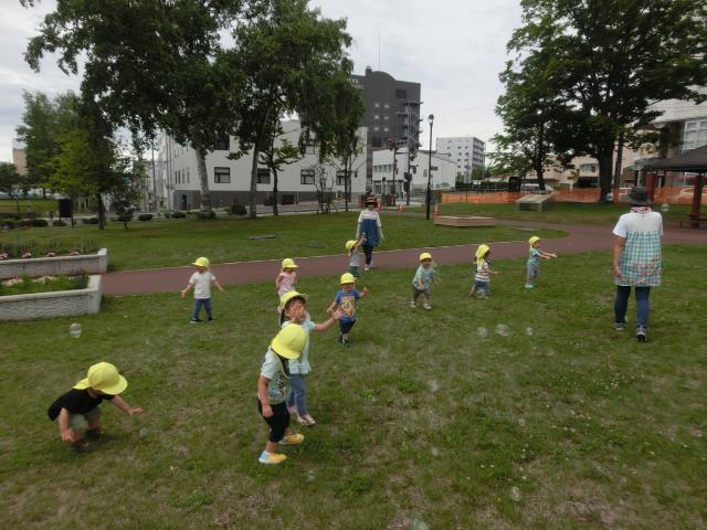 広~い公園で、しゃぼん玉を追いかけ元気に走りまわってきました。