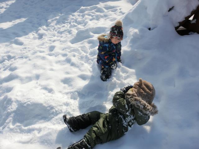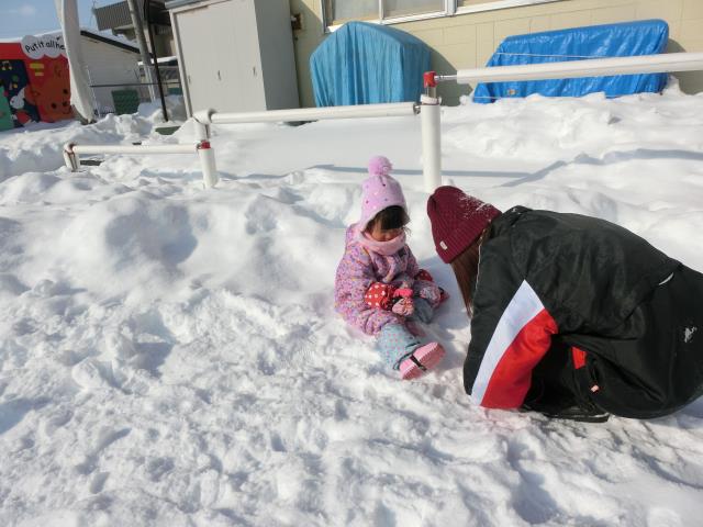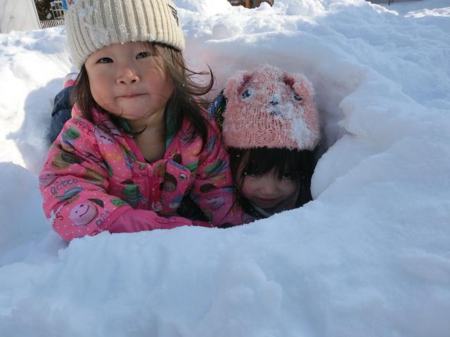 興味深々に近寄り、中を覗き込んだり、お友達と一緒に入ったりと、沢山雪に触れて遊びました。