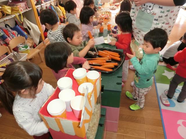 店員さんになりきり、沢山お客さんを呼び、売り買いを楽しんでいた子ども達でした。
