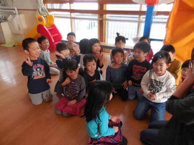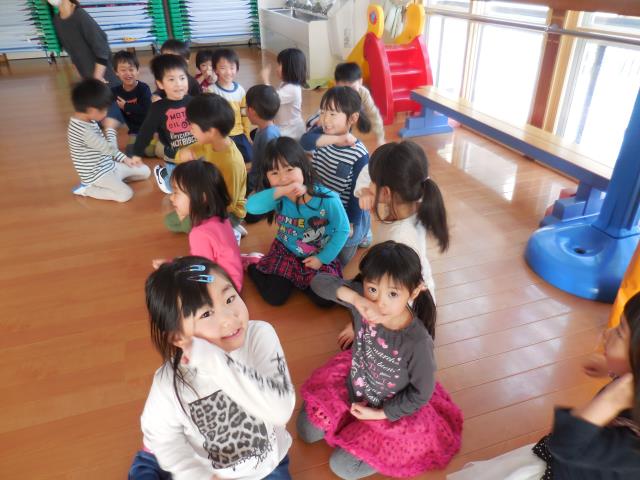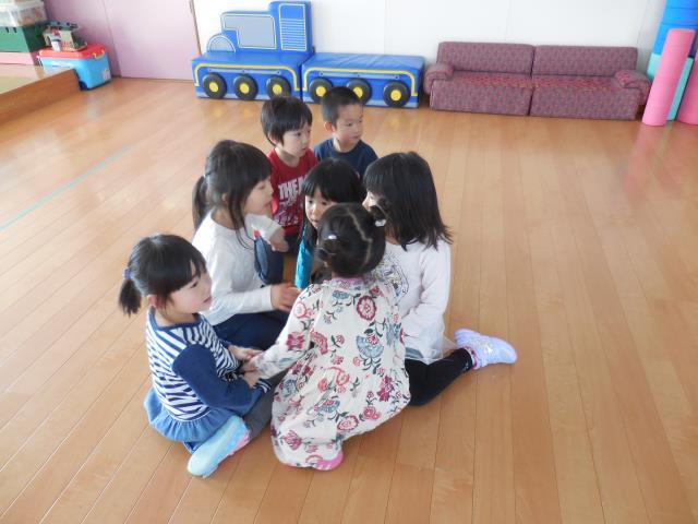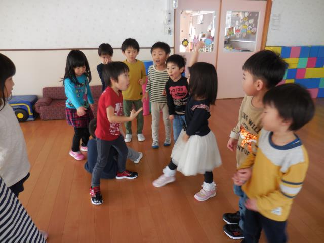 子ども達が大好きな「むっくりくまさん」「あぶくたった」「花いちもんめ」を行い、どのあそびも大盛り上がりのさくら組さんでしたよ。