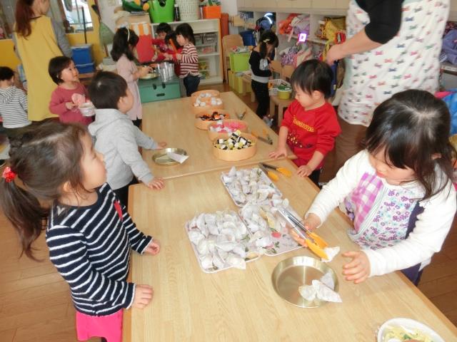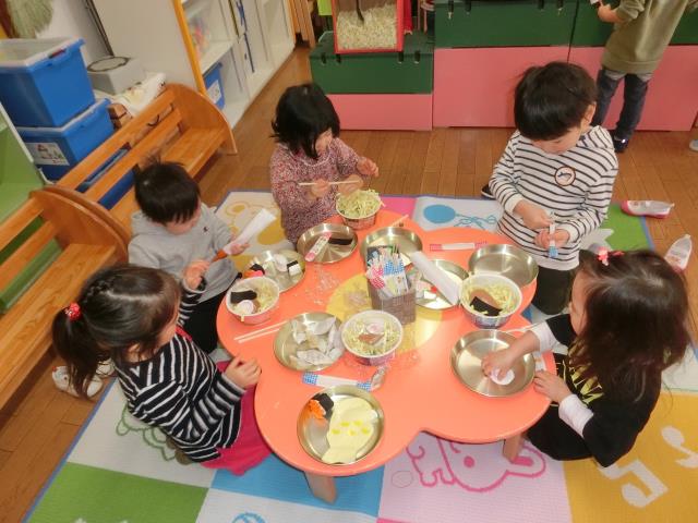ハサミでネギを細かく切ったり、なるとの模様をマジックで描いたり、のりやゆで卵はのり付けをしました。