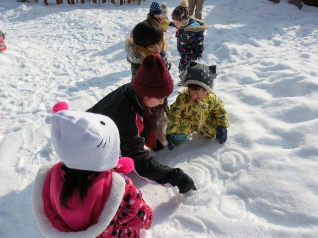 先生と一緒に雪玉を作った後、雪だるま作りにも挑戦!!