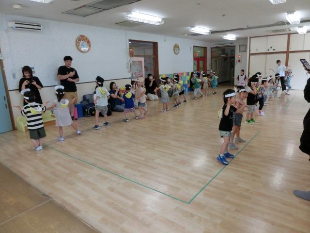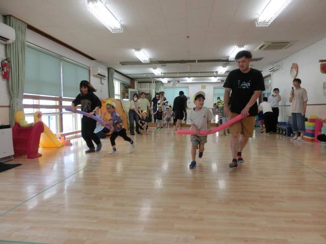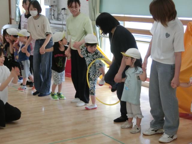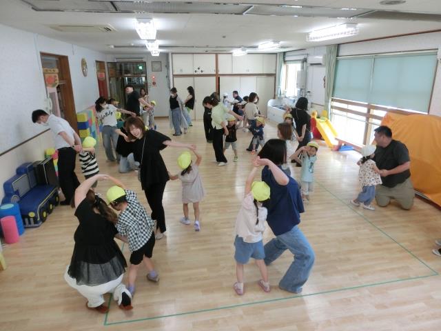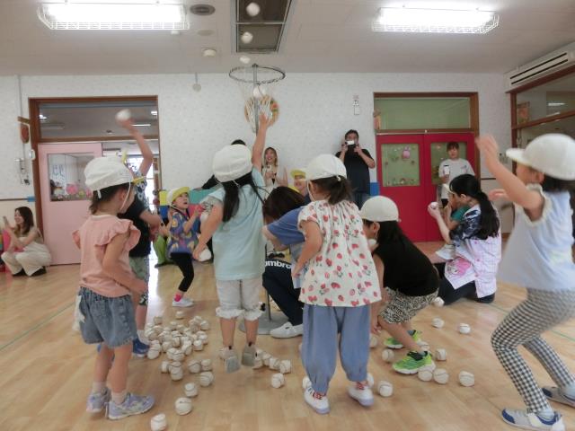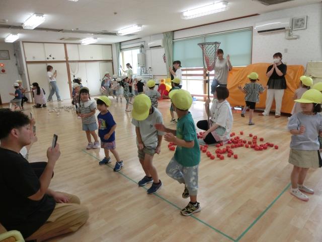 とても暑かったのでホールで行い、体操やダンシング玉入れをしている所を見て頂き、後半は親子一緒にゲームを楽しんでいます。