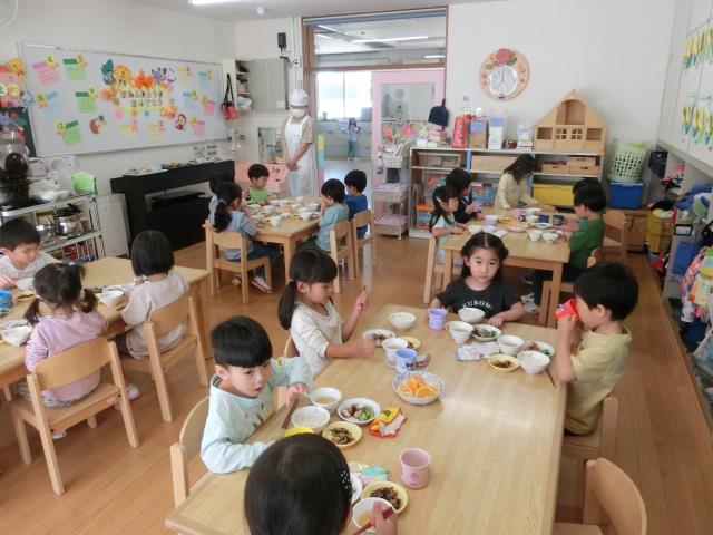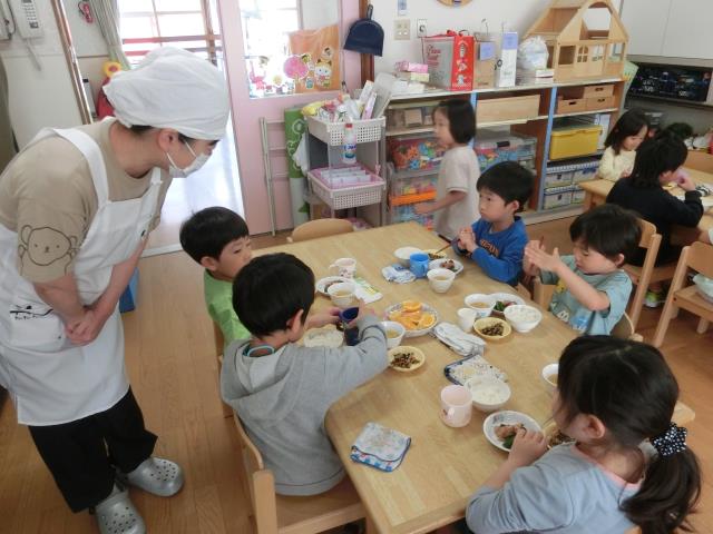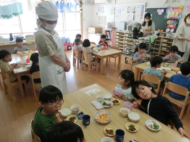 今日は給食室の調理師さんが、さくらぐみの給食を食べている様子を、見に来てくれています。