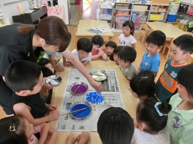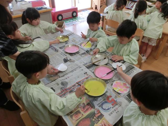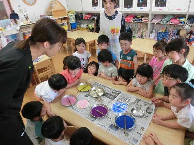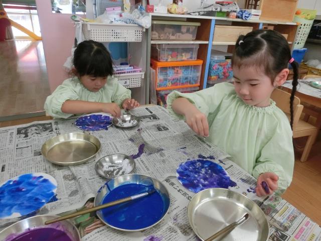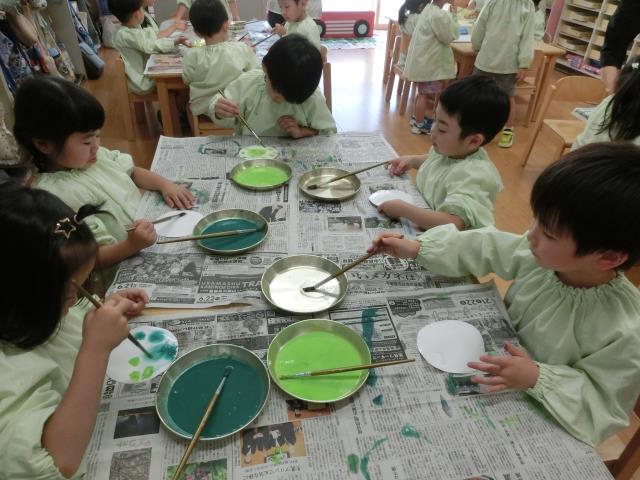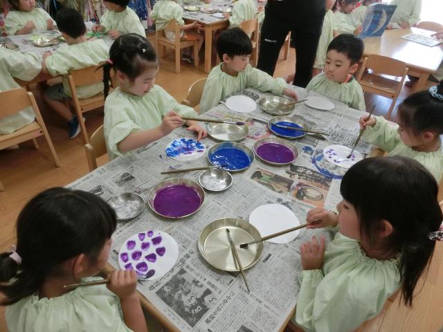 筆を使って画用紙に水をつけ、絵具をのせてにじむ様子に大喜びの子ども達。