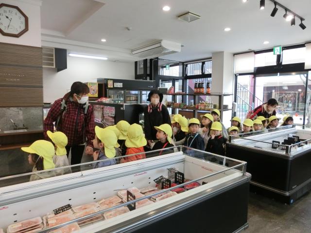 お肉屋さんでは、お店の中に入っても良いと言っていただき、大きなお肉に驚いていた子ども達です。
